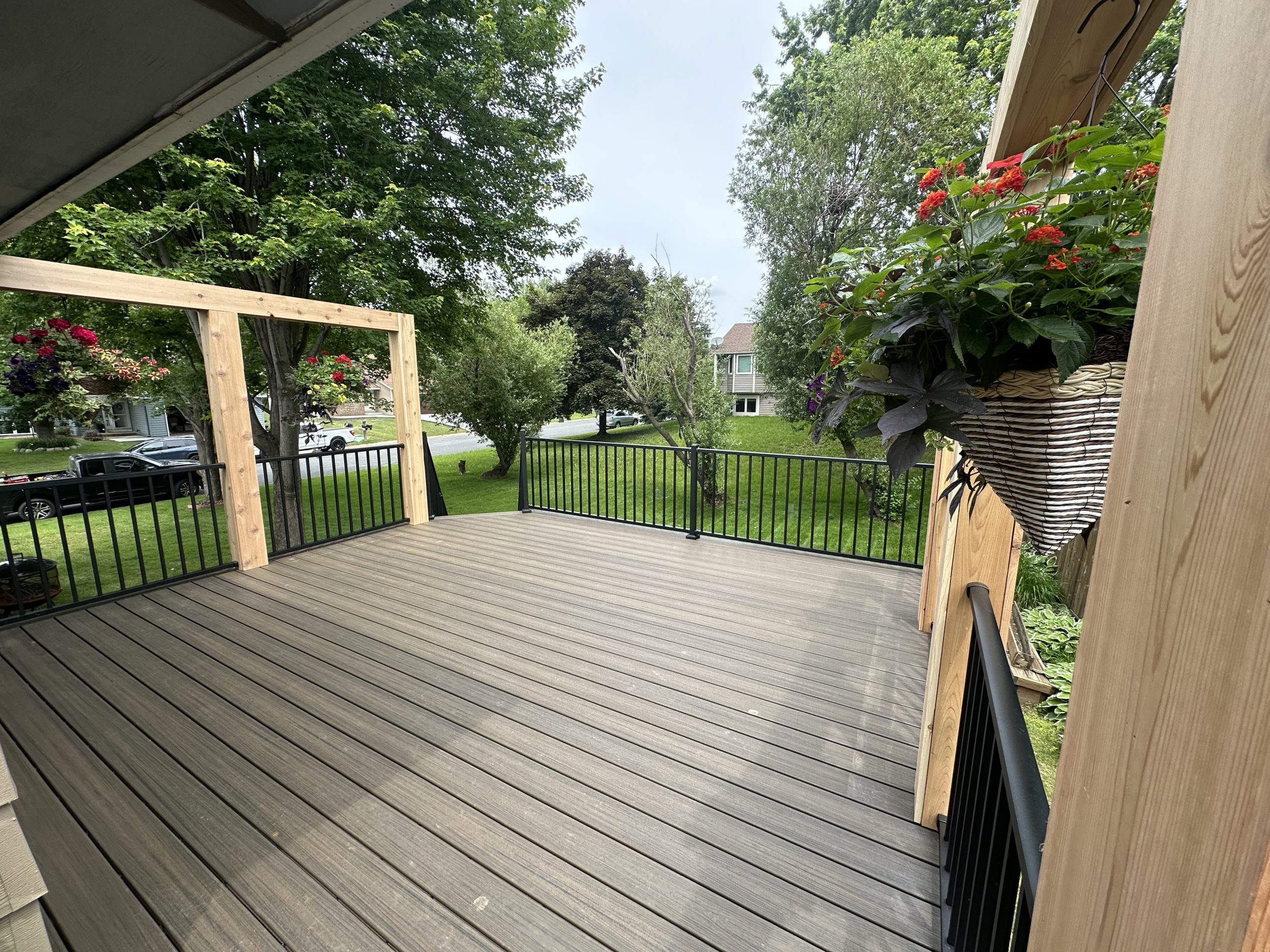 The surface features Trex Enhance composite decking, known for its durability, low maintenance, and resistance to fading, staining, and scratching. This material ensures long-lasting beauty with minimal upkeep.