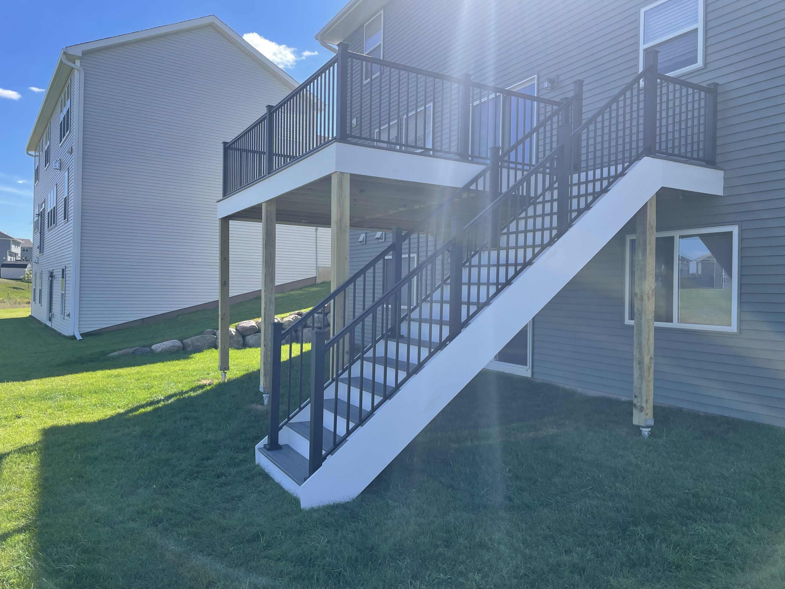 This modern deck installation in Rosemount created a durable and stylish outdoor space designed for relaxation and entertaining. The project combines premium composite decking with sleek railing and lighting features for both functionality and visual appeal.